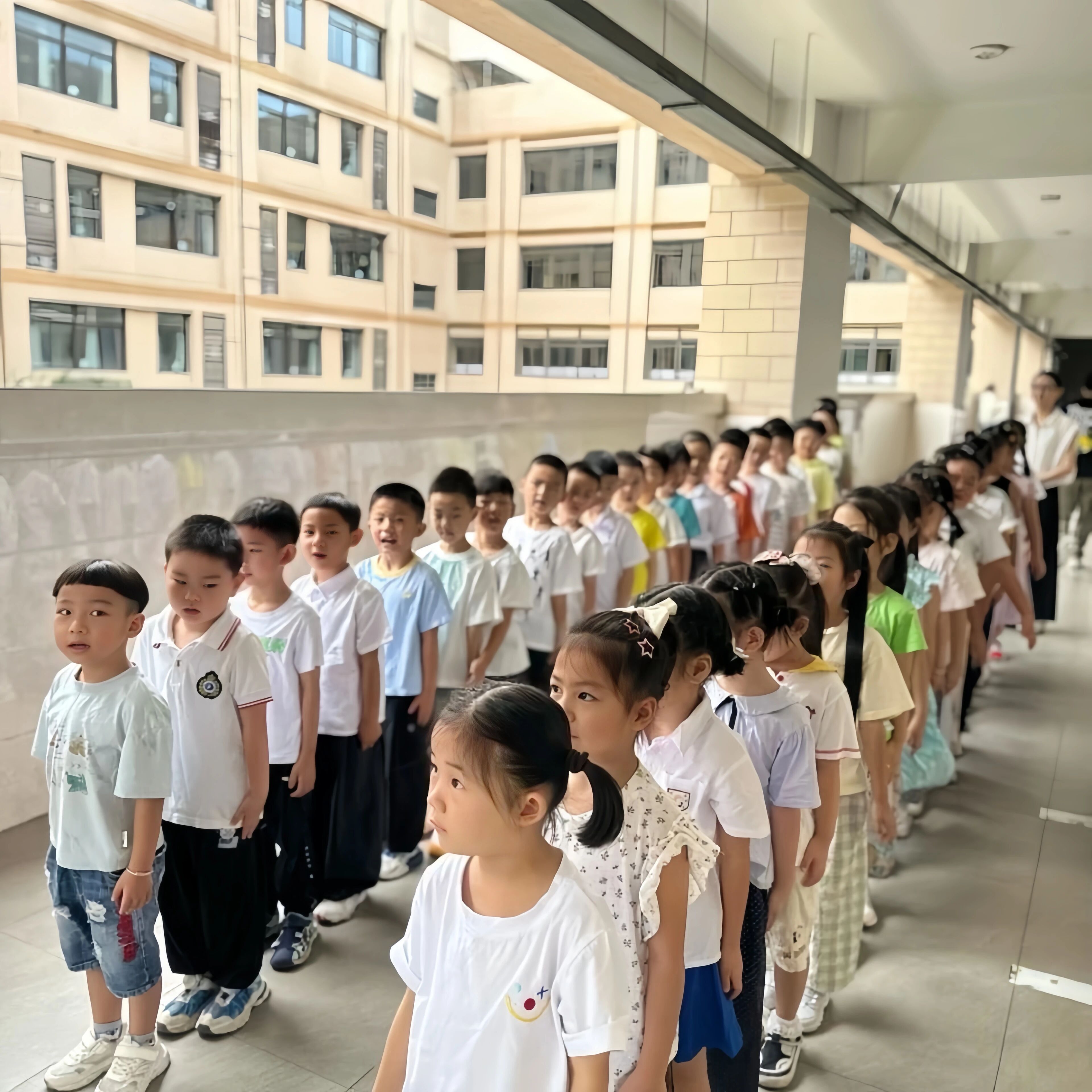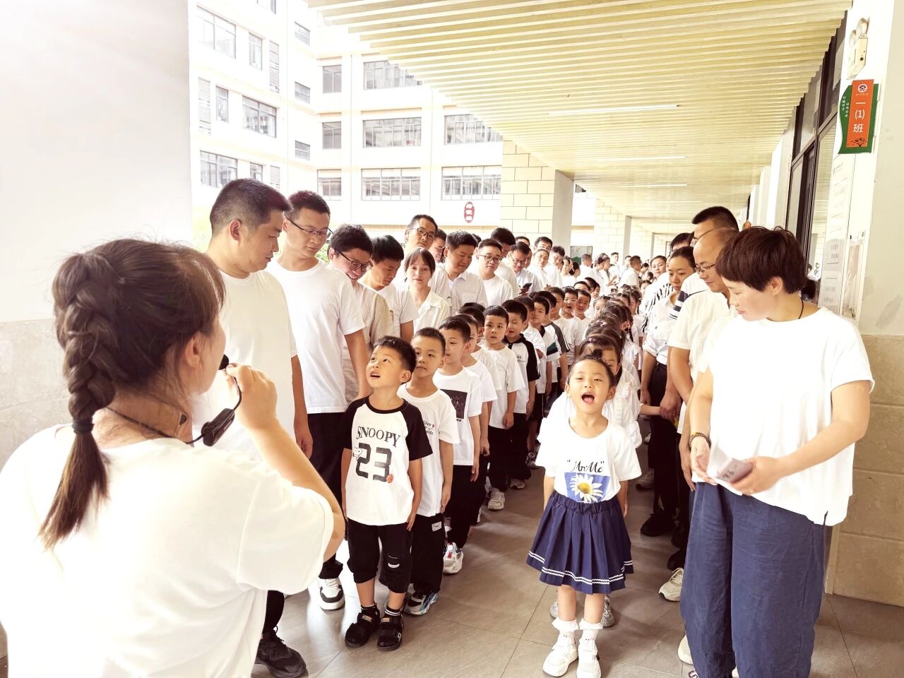 画面定格:教学楼走廊宛如一条温情的通道,两侧是并肩而立的父母,中间是两队整齐站立的一年级新生。父母们微微侧身,含笑的目光聚焦在孩子身上,而孩子们挺直小小的身板,眼神里交织着新奇与期待。
