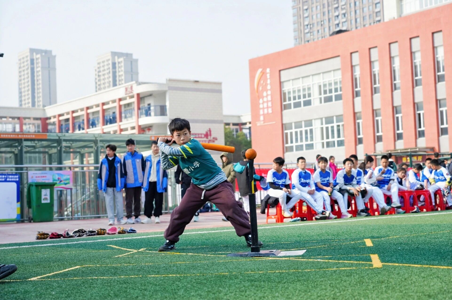 画面定格:赛场上,孙浚熙同学双手紧握垒球棒,身体如弓弦般绷紧,目光如炬直视前方。阳光勾勒出他专注的侧影,蓄势待发的姿态里,凝聚着整支队伍一个月汗水凝结的力量。
