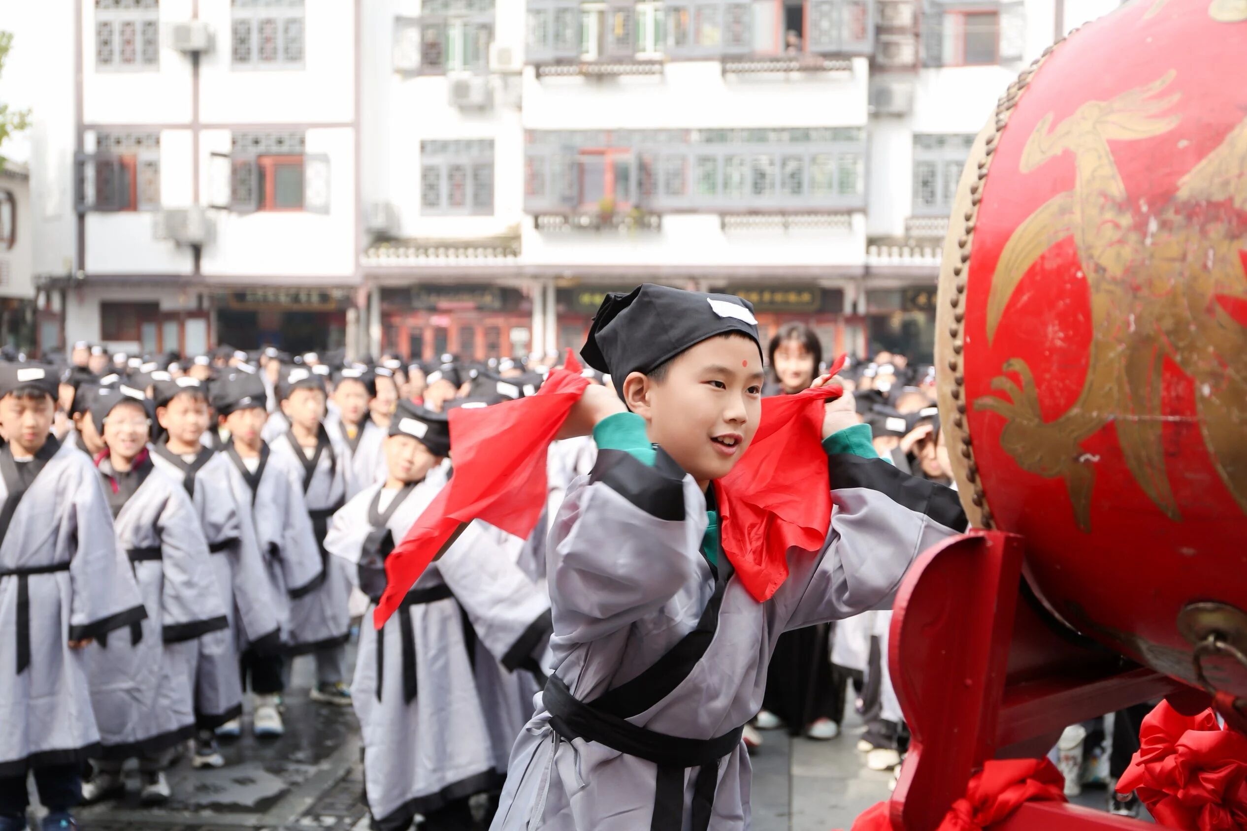 画面定格:三河古镇的青石板路上,一位四年级的男孩身着传统服饰,双手高举鼓槌,目光灼灼地注视身前的立鼓。鼓槌即将落下的瞬间,他挺拔的身姿与肃穆的神情,仿佛凝聚了所有成长的能量。