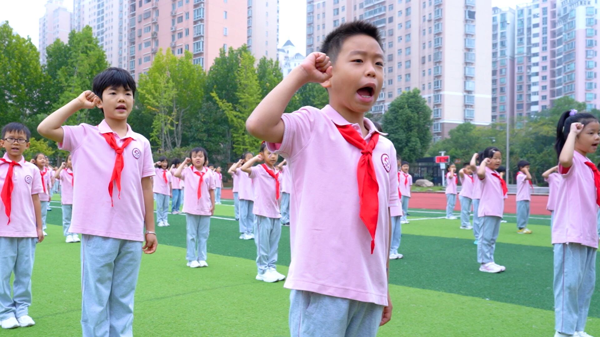 画面定格:入队仪式上,二年级的阮俊熙小朋友昂首挺胸,正张大嘴巴用力宣誓。他的拳头紧握,高举至耳畔,脖颈因用力而微微绷直,清澈的眼睛里映着队旗的鲜红。