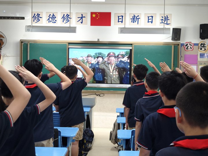 画面定格:屏幕的光映照着整间教室,当抗战老兵的面容出现时,孩子们齐刷刷地起立。数只右手高举过头,标准的少先队礼整齐划一,教室里满是肃穆与敬重。