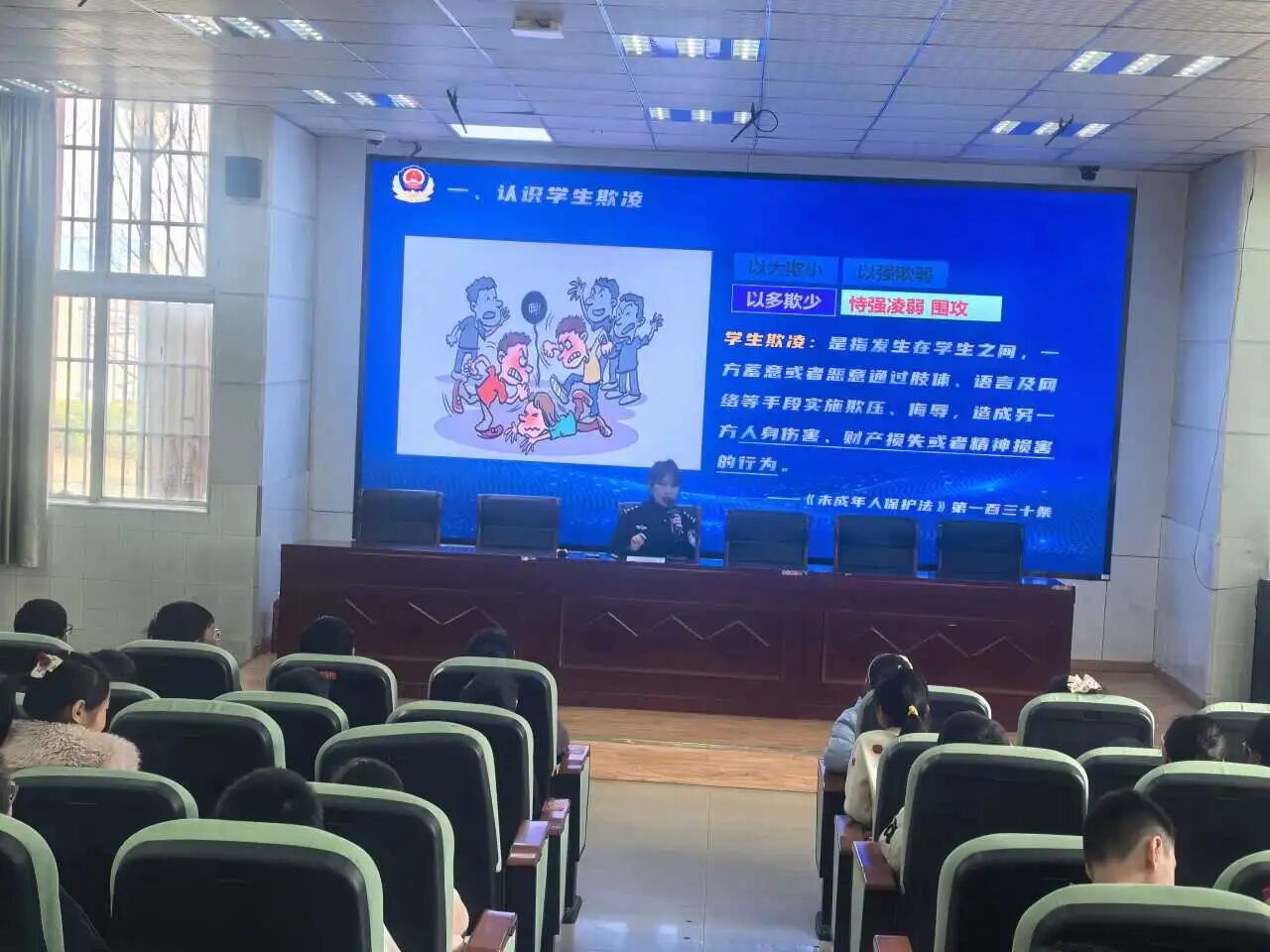 此次活动通过专题讲座、情景模拟、互动问答等形式,为全体师生送上了一堂实用而生动的“安全必修课”。在校园防欺凌环节,派出所民警结合真实案例,深入剖析了校园欺凌的多种形式,包括肢体冲突、言语侮辱、社交孤立及网络欺凌等,明确指出欺凌行为不仅会对受害者造成身心伤害,欺凌者和旁观者也可能因此承担法律责任。民警强调:“欺凌不是玩笑,而是违法行为!”并现场教授学生“三步骤应对法”——及时报告(向老师、家长或警方求助)、保留证据(聊天记录、伤痕照片等)、寻求法律帮助。学校还公布了“防欺凌举报箱”和24小时求助热线,鼓励学生勇敢发声,不做冷漠的旁观者。