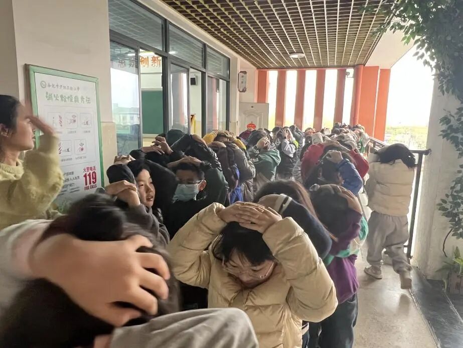 下午,随着急促的应急警报声骤然响起,演练正式拉开帷幕。各班级任课教师立即停止教学活动,第一时间向学生明确疏散方向与注意事项,组织学生迅速寻找掩体进行躲避,随后起身、弯腰低姿,沿着预先规划的疏散路线有序撤离。