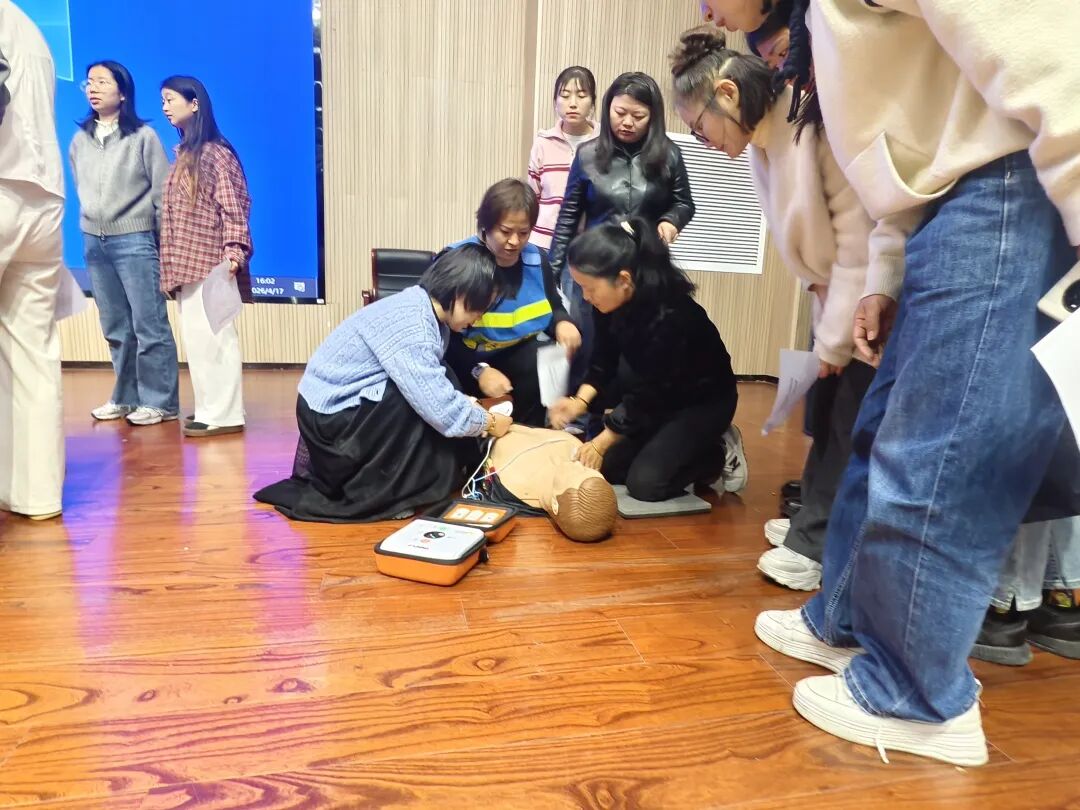 演示自动体外除颤仪“开机—贴电极片—听语音提示—电击除颤”全流程,强调CPR与AED协同施救的“黄金组合”,消除急救设备使用障碍。