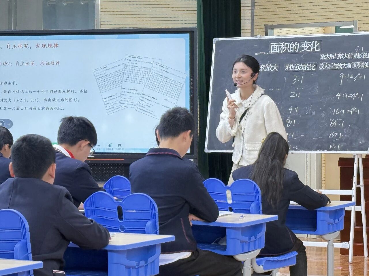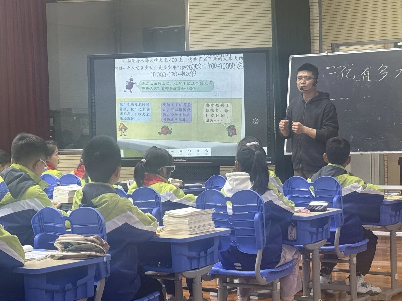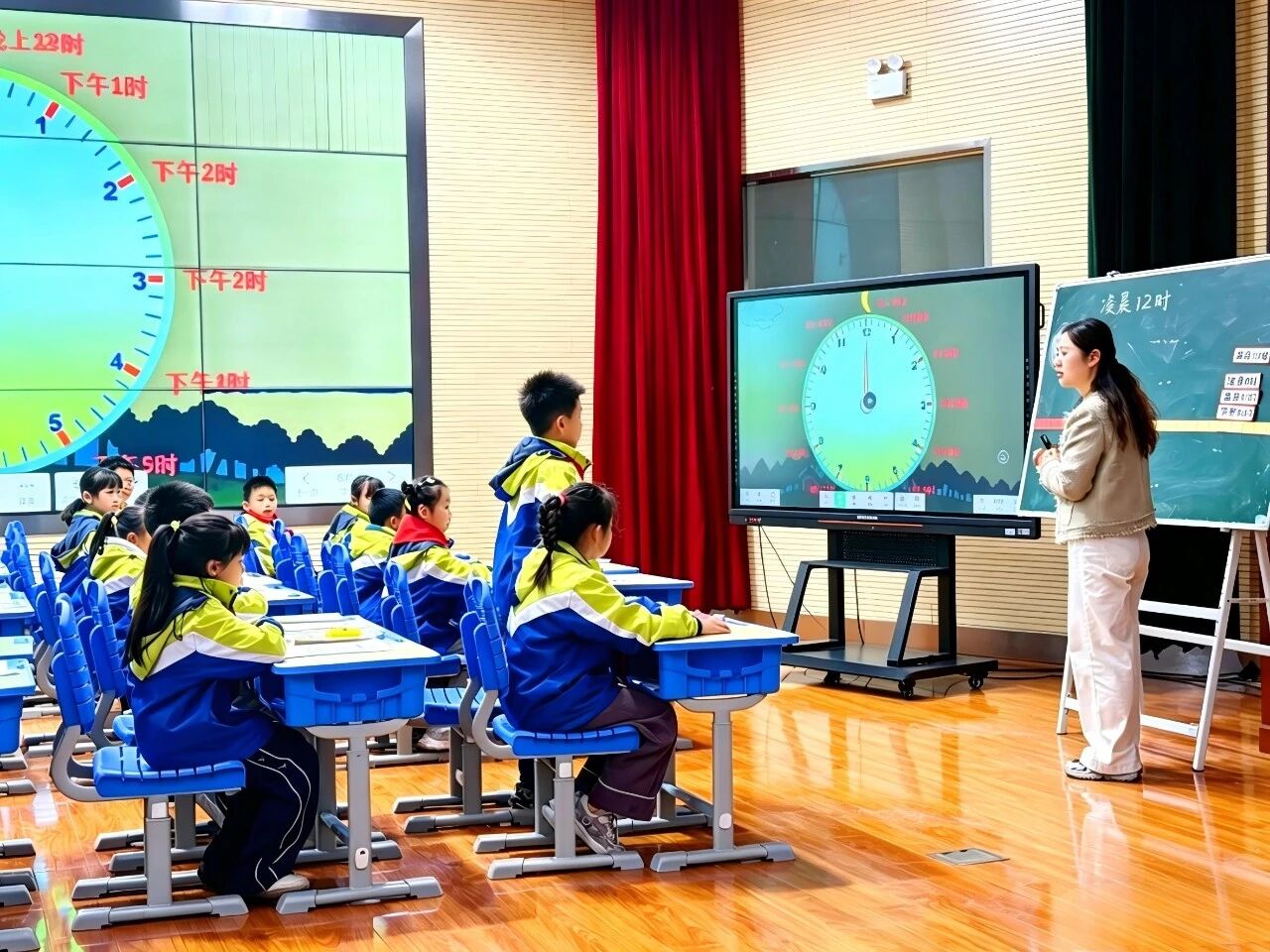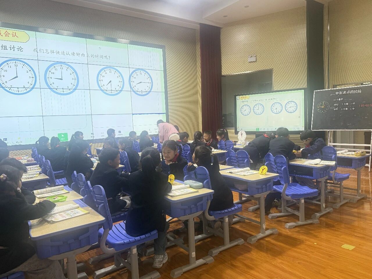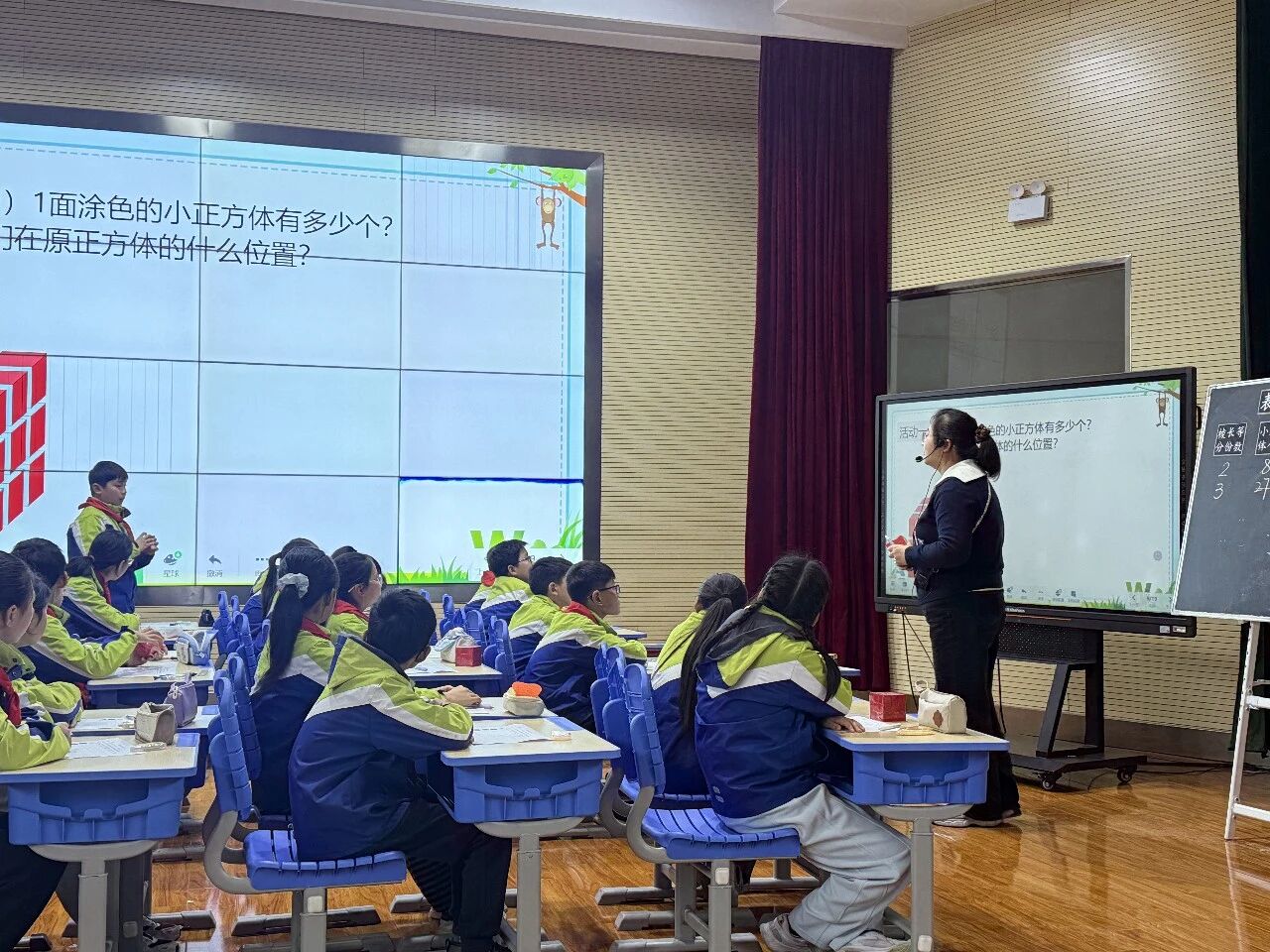 上午8时20分,清脆的上课铃声拉开了本次评比的序幕。六位老师紧扣“实践育人”主题依次登场,带来了六节风格各异、亮点纷呈的优质课。吴晓伟老师执教二年级《一天时间的表示》,以学生一日作息为真实线索,借助自制钟表学具设计系列实践任务,让抽象的时间概念转化为可触摸的生活体验;朱玉娇老师带来三年级《寻找宝藏》,以沉浸式探险游戏贯穿课堂,学生化身“小小探险家”在闯关解谜中掌握位置与方向的核心知识;管晓翠老师执教五年级《表面涂色的正方体》,引导学生亲手拆解学具、观察推理,自主发现规律并建立空间观念;黄子盈老师执教六年级《面积的变化》,结合多种平面图形面积变化规律的猜想验证,让学生在学习中感受数学的独特魅力;崔瑞老师的四年级《一亿有多大》,通过趣味探究实验帮助学生直观建立大数概念、培养数据分析能力;姚丹丹老师执教二年级《钟面表示的时间》,用童趣化语言和互动游戏,充分调动低年级学生积极性,扎实夯实时间认读基础。老师们以各具特色的教学设计、自然流畅的课堂掌控、扎实有效的教学实施,赢得了现场观摩教师的阵阵掌声。