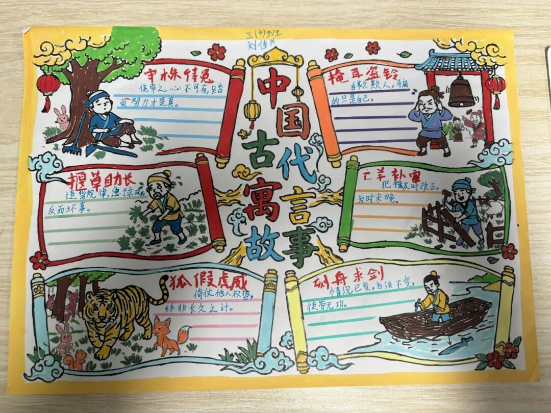 活动期间,校园里处处洋溢着书香氛围。三楼南楼梯口、班级走廊变身“阅读展示区”,一张张构思精巧的寓言手抄报,一个个言简意赅的寓言读书卡,一幅幅色彩丰富的寓言画,一份份学有所获的项目化学习单整齐陈列,充分展现了孩子们沉浸式阅读的收获与成长,吸引师生驻足欣赏。