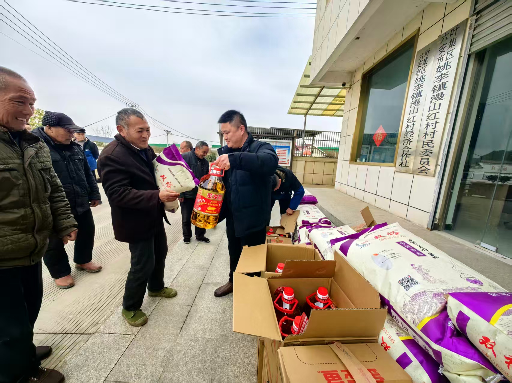 董会胜的家乡姚李镇漫山红村,曾是一个交通闭塞、产业薄弱的小村落。年少时,他带着对美好生活的憧憬与希冀,在商贸行业摸爬滚打,凭借着吃苦耐劳的韧劲和敢闯敢拼的魄力,创办了自己的企业,一步步站稳脚跟。但无论事业做得多大、走得有多远,家乡的一草一木、乡邻的淳朴笑脸,始终是他心中最牵挂的念想。近日,利用年头岁尾,他心系村里老党员和部分贫困群众,毅然决然向村党支部表示,为村里的老党员和部分困难群众表一点微薄心意。元月10日下午,董会胜在村党支部书记刘益林等带领下,带着优质大米、食用油等慰问品和沉甸甸的一片爱心,一起送到村里老党员、困难群众家里,同时为他们带去新春的问候与温暖。