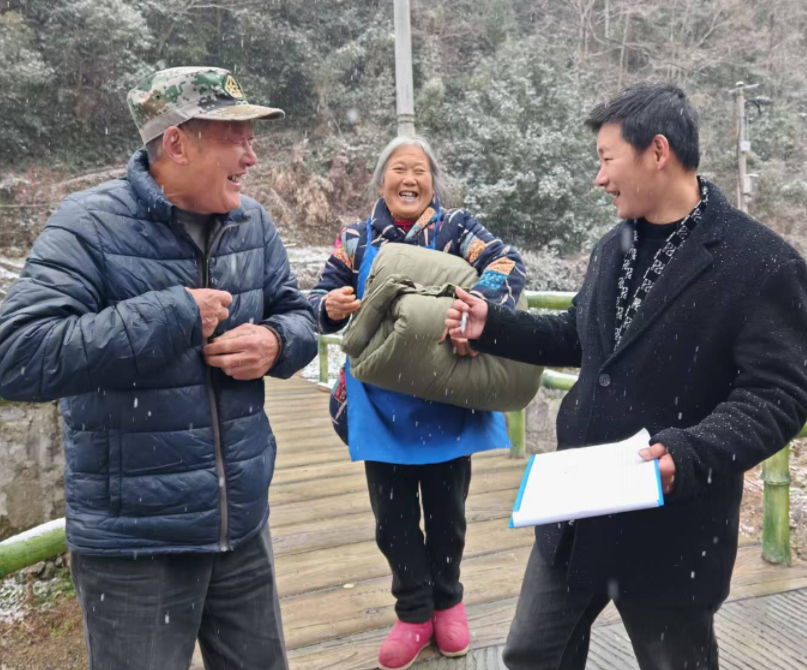 寒冬已至,12月20日,黄山市徽州区洽舍乡迎来今冬首场降雪。气温骤降、道路覆雪,给群众生产生活带来诸多不便。为切实保障困难群众温暖安全过冬,传递党委、政府的关怀与社会温暖,洽舍乡党委政府迅速组织乡、村两级干部,在全乡范围内开展独居老人走访慰问活动,为他们送上御寒物资,以实际行动筑牢寒冬中的“温暖防线”。