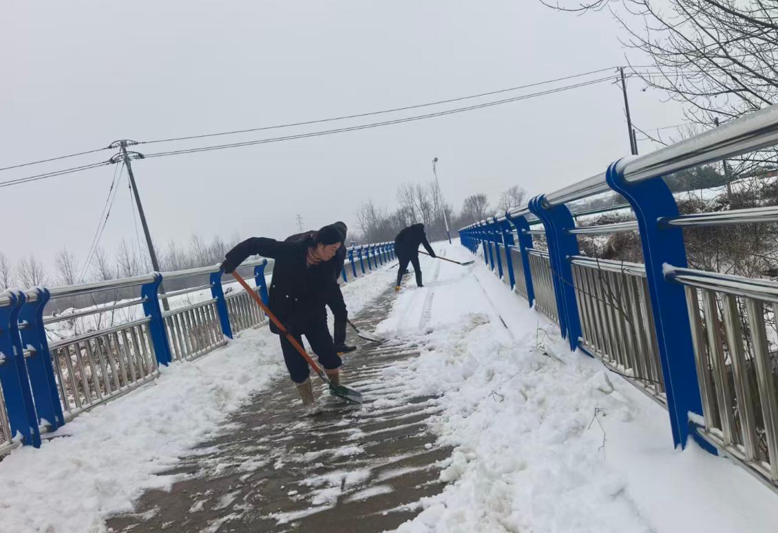 高效除雪,打通“暖心路”。 铲车沿主干道往复作业,清除路面厚重积雪;人工队伍则重点清理巷道、桥面、坡道、村部广场及周边易滑路段。大家不畏严寒、齐心协力,挥锹铲雪、撒盐防冻,现场忙碌而有序。村“两委”成员分片督导,确保清雪不留死角、通行不留隐患。经过数小时连续奋战,村内主要道路积雪基本清理完毕,交通恢复通畅,为群众出行创造了安全条件。