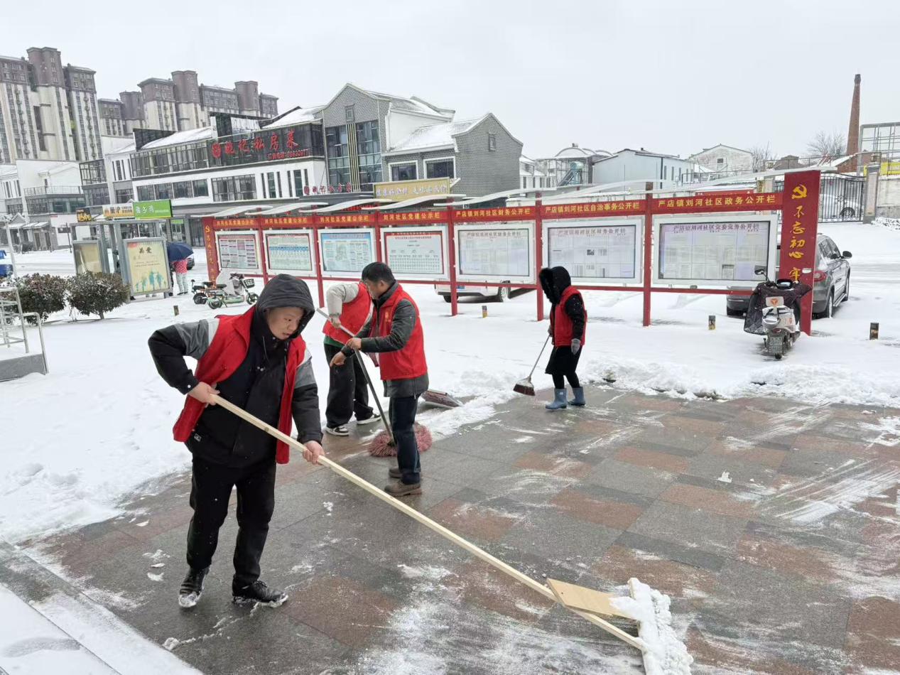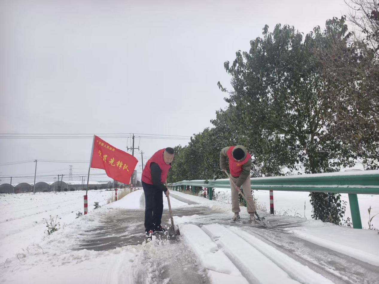 一呼百应齐上阵,在应急处置上见真章。镇党委组织160名镇村两级干部、党员应急队伍迅速投入清雪除冰工作,重点对主干道路、村庄出入口、学校周边和人员密集区域开展集中清理。党员干部带头铲雪破冰,志愿者协同配合,一抹抹“志愿红”在雪中格外醒目,有效缓解了道路湿滑、通行不畅等问题。同时,各村(社区)依托网格化管理机制,明确责任区域和包保人员,对群众反映的出行难题及时响应、现场处置,确保道路有人清、隐患有人管、问题不过夜,用实际行动筑牢群众出行“安全防线”。