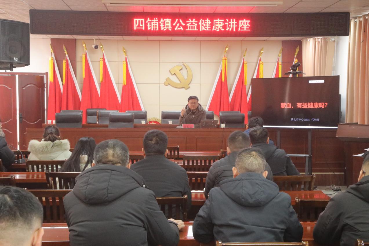 2月2日,濉溪县四铺镇举办公益健康讲座,旨在普及无偿献血科学知识,倡导奉献精神与社会责任感。镇直机关干部职工及各行政村党组织负责同志参加了此次讲座。
