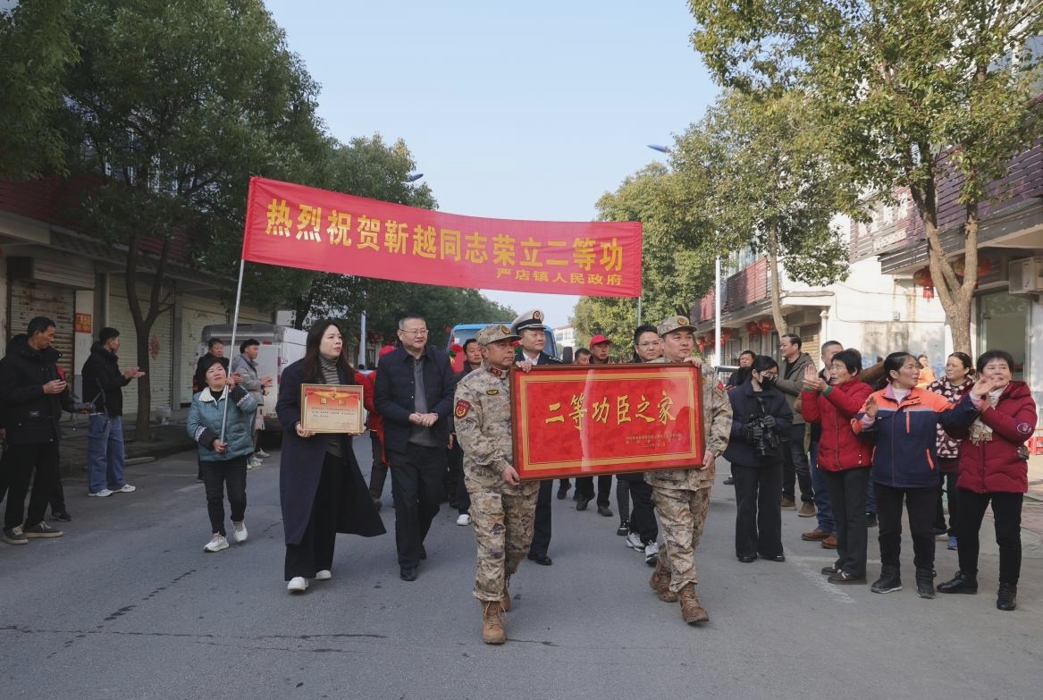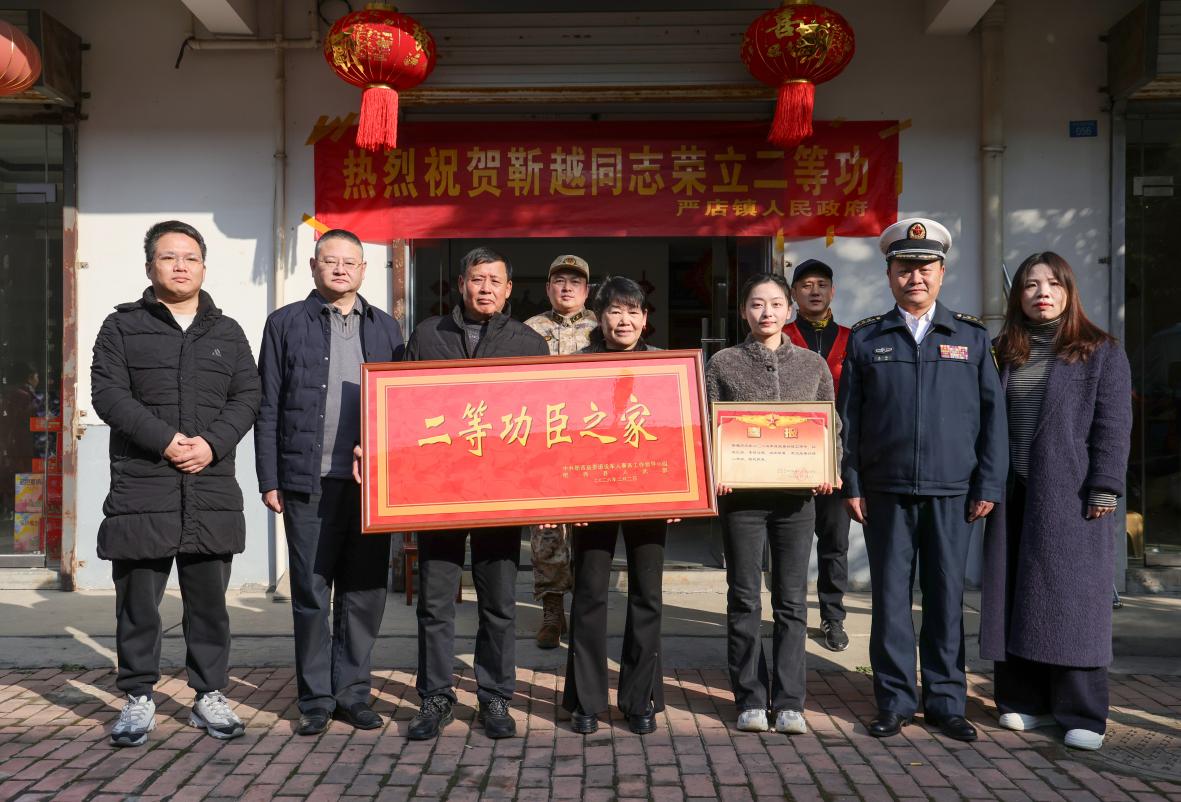 今日上午,肥西县严店镇苏小街道洋溢着一片喜庆与荣光。伴随着欢快的锣鼓声和邻里乡亲热烈的掌声,一支由县退役军人事务局、县人武部、严店镇党委政府主要领导组成的慰问组,穿村而过,为荣立二等功的东南村现役军人靳越同志的家庭,隆重举行立功喜报送达仪式。