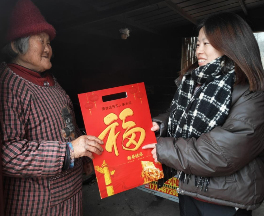 活动中,服务站工作人员与村干部组成“送福小分队”,将精心定制的春联、福字逐一送至退役军人家中。每到一户,工作人员都与老兵们亲切交谈,仔细询问生活起居与身体状况,认真倾听他们的从军故事,贴心叮嘱冬季防寒保暖与居家安全事项。“这春联不仅添了年味,更让我们感受到了‘娘家人’的牵挂!”参加过边境自卫反击战的老兵王大爷捧着春联,脸上满是笑意,连连称赞。