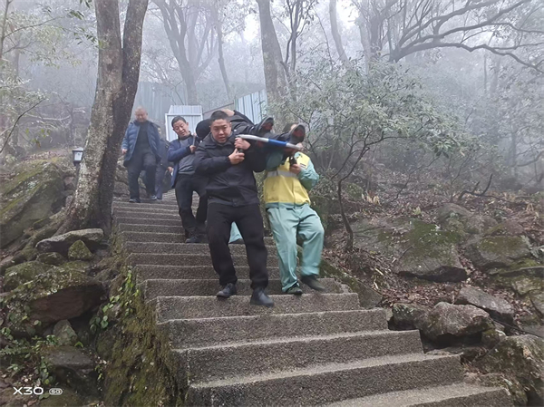黄山之巅,寒风凛冽,却有一群人用坚守与勇气,守护着游客的平安。2月17日(正月初一)下午4点40分,汤口旅服公司工作人员接到温泉综治组电话,得知半山寺有一名摔伤游客需要紧急转运下山。时间就是生命,公司立即安排张志为、蒋永安、吴来宾、叶国忠四名工作人员,联合两名环卫人员,迅速前往立马桥接应。