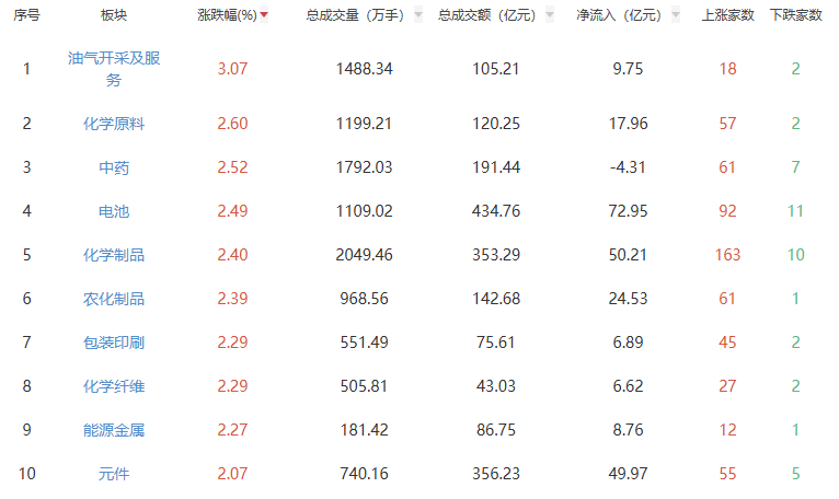 板块方面,油气开采及服务、化学原料、中药等板块涨幅居前,白酒、旅游及酒店、机场航运等板块跌幅居前。