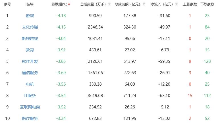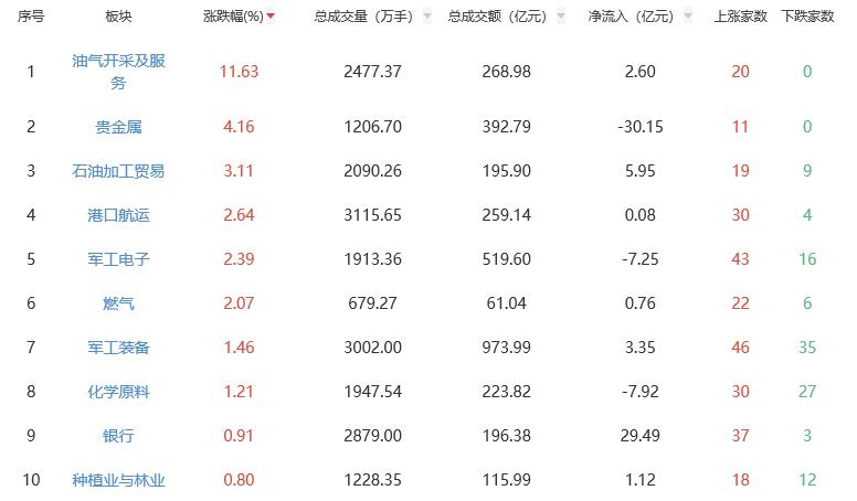 板块方面,油气开采及服务、贵金属、石油加工贸易等涨幅居前,游戏、文化传媒、影视院线等跌幅居前。