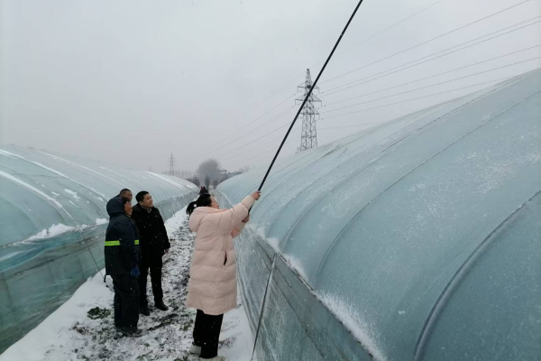 (图为艾亭镇政府镇长刘通和党委委员苏君在雨雪中指导种植户开展积雪清理)
