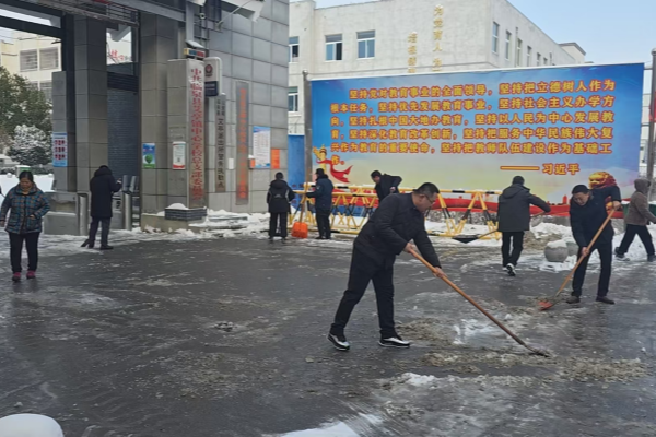 (图为艾亭中心校组织学校职工开展积雪清理)