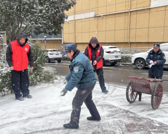 行动中,星园街道福宁社区工作人员与物业员工不畏严寒,齐心协力,在小区主干道、单元门出入口、坡道等关键区域,科学播撒环保型融雪剂,利用其降低冰点的原理,加速冰雪消融,从源头上防止路面结冰打滑。“我们早准备一步,业主的平安就多一分保障。”福宁社区书记王治伟在现场表示。与此同时,福宁社区依托“线上预警+线下处置”联动机制,早在降雪前便通过业主群、公告栏等多渠道,滚动发布天气预警、防滑防冻温馨提示,细致提醒居民“关好窗、裹好管、慢出行”,将主动服务与安全教育做在前头。