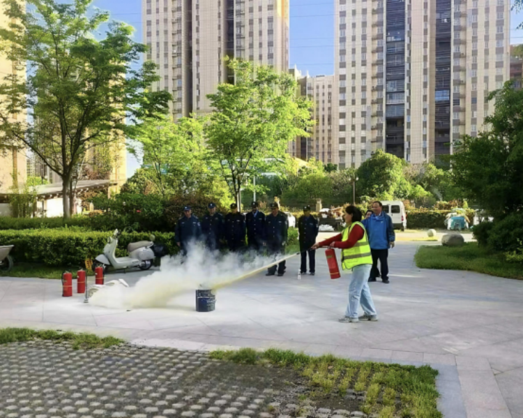 演练模拟了引发火情的场景,随着烟雾弹燃放,物业中控室立即启动应急预案,保洁与前台人员协助疏散组引导“居民”用湿毛巾捂住口鼻、弯腰沿墙撤离;物业灭火组2分钟内抵达现场,利用灭火器对火势进行压制。社区两委与社工则负责现场协调、人员清点及模拟伤员安抚。演练还设置了实操环节,在消防专员指导下,大家轮流动手操作灭火器扑灭油盆火,确保“人人会操作、个个能应急”。